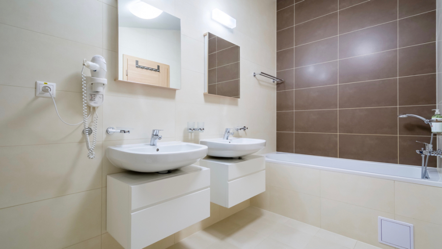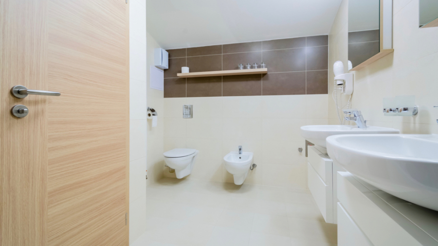 - Priestranná kúpeľňa s vaňou, WC, bidetom a 2x umývadlom