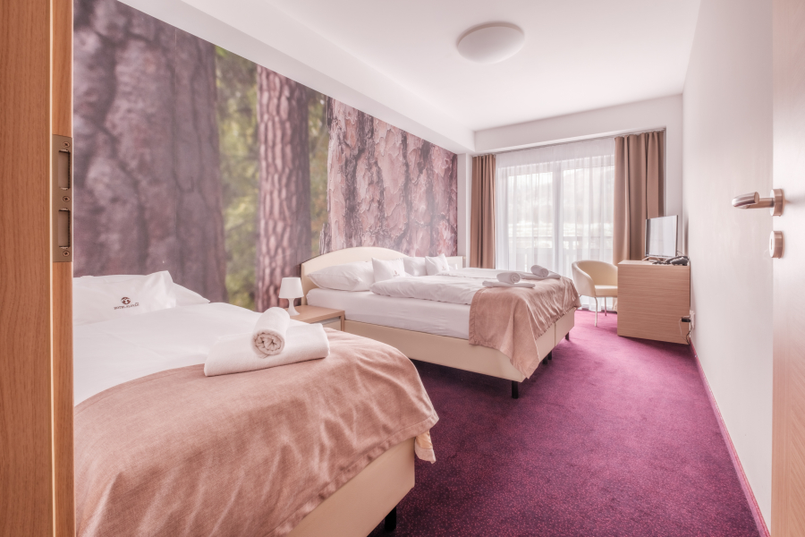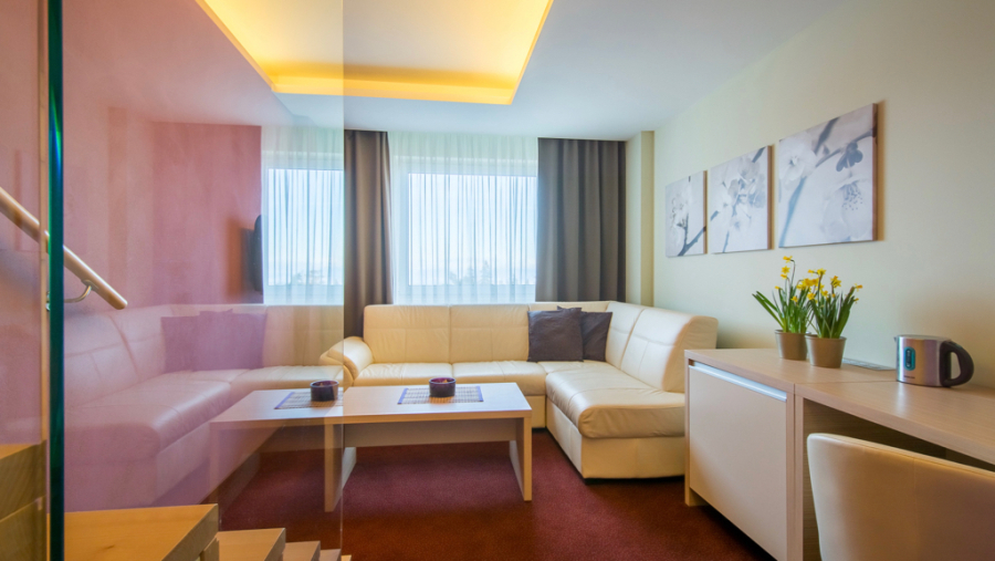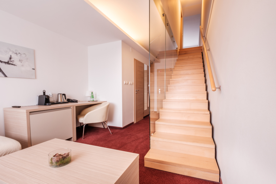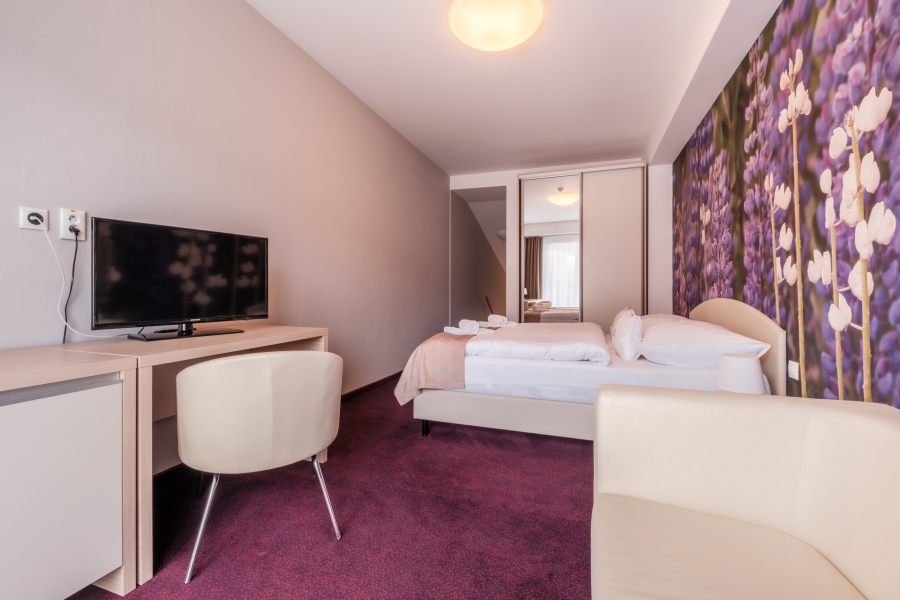 Najväčší z našich apartmánov sa nachádza na piatom poschodí hotela a pozostáva z dvoch spální a obývacej časti. Nachádza sa tu tiež priestranná kúpeľňa s vaňou, dvomi umývadlami, bidetom a WC a k tomu ďalšie 2 samostatné WC. Jedna spálňa disponuje manželskou posteľou, druhá spálňa manželskou posteľou, jedným lôžkom a balkónom s výhľadom na Tatry. Gauč v obývacej miestnosti sa dá rozložiť pre 1-2 deti max. do 12 rokov (spacia plocha po rozložení na dve prístelky je 120x170 cm), celkovo tak tento apartmán poskytuje ubytovanie až pre 7 osôb.