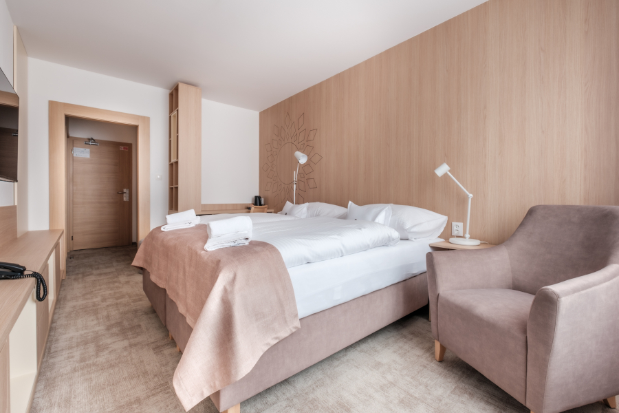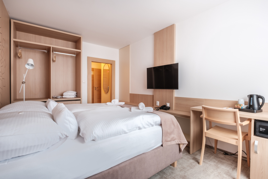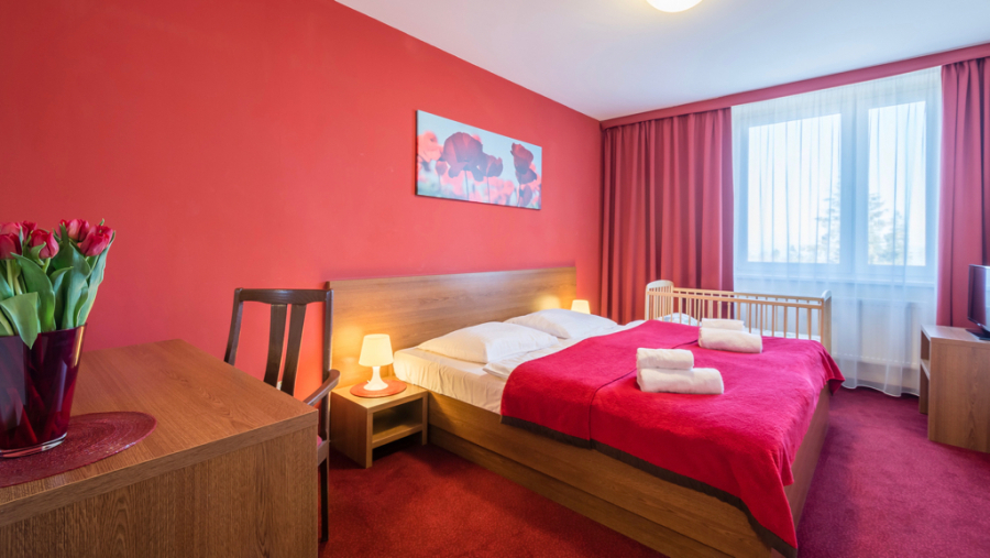 Štvorlôžková family izba je ideálnym riešením pre viacčlennú rodinu, ktorá má rada svoje pohodlie. Pozostáva z dvoch dvojlôžkových izieb, ku každej z nich prislúcha samostatná kúpeľňa so sprchou alebo vaňou a WC, nájdete v nej tiež 2x LCD TV, chladničku, rýchlovarnú kanvicu a set kávy a čaju. Niektoré izby majú aj balkón, a sú orientované do doliny aj na Tatry. Na vybraných izbách je možnosť prístelky alebo detskej postieľky po dohode s recepciou.