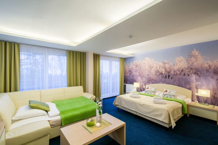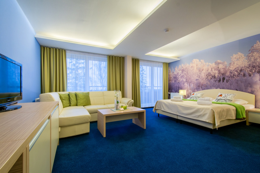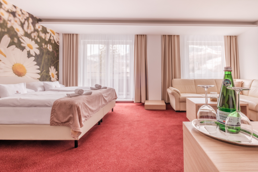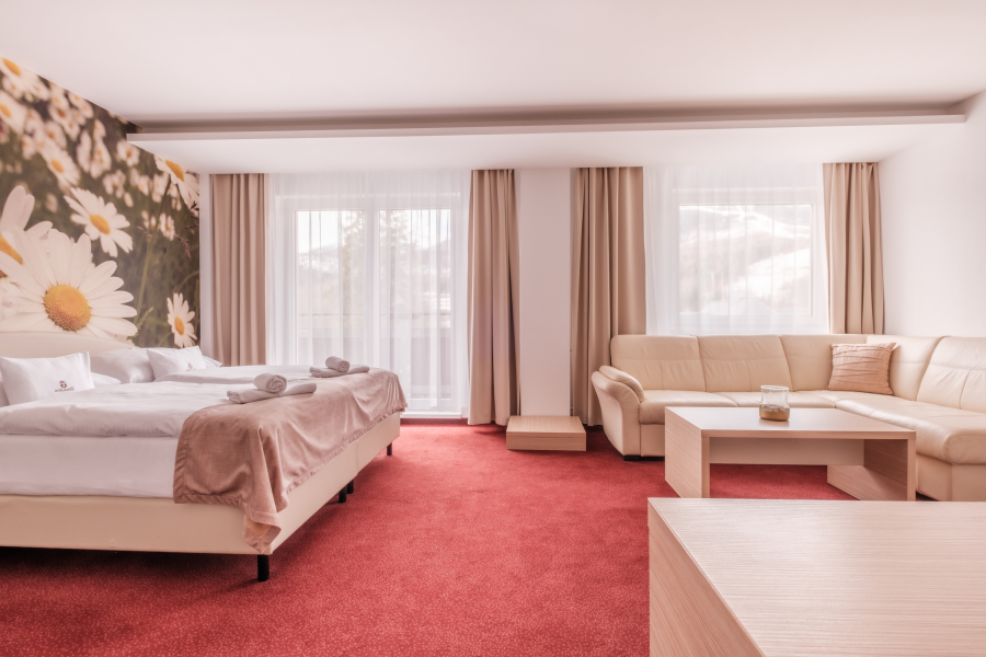 Vychutnajte si nádherný výhľad z vyššieho poschodia hotela v luxusnej a štýlovej izbe Suite. Pozostáva z jednej miestnosti kde sa nachádza manželská posteľ a rozkladací gauč, priestrannej kúpeľne s vaňou alebo bezbariérovým sprchovým kútom a balkóna. Rozkladací gauč je vhodný pre 1-2 deti max. do 12 rokov (spacia plocha po rozložení na dve prístelky je 120x170 cm).